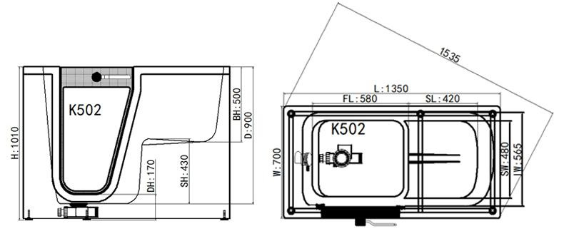 Afmetingen: 1350 × 700 × 1010 mm – compact, geschikt voor kleinere badkamers